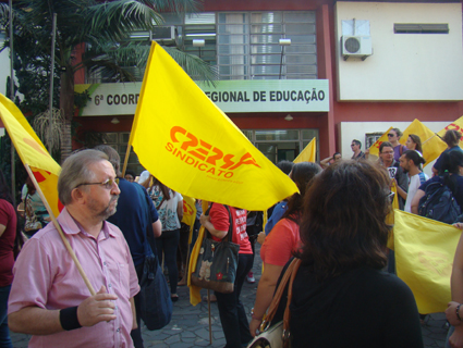 Em paralisação, professores estaduais e representantes do Cpers estiveram em frente à 6ª Coordenadoria Regional de Educação