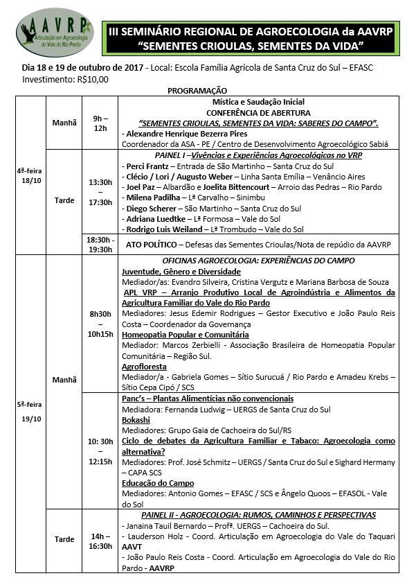 O tema da terceira edição do evento são as “Semestes Crioulas, Semestes da Vida”, e por isso, toda a programação tratará, de forma direta ou indireta sobre o assunto. Na manhã dessa quarta-feira, a palestra “Sementes Crioulas, sementes da vida: saberes do campo”, abre as atividades. Na tarde de hoje será a vez do painel “Vivências e Esperiências Agroecológicas no Vale do Rio Pardo”. Nesse momento, sete pessoas de variadas idades trarão seus depoimentos sobre o uso de sementes crioulas no cultivo.
