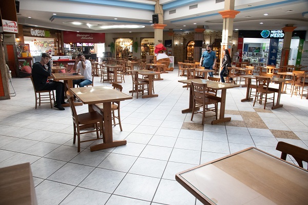 Uso de mesas na praça de alimentação foi retomada ontem, 18, com regras de distanciamento social para o público Crédito: Rolf Steinhaus – Riovale Jornal