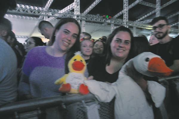 Um momento especial e que virou uma brincadeira entre os irmãos foi quando receberam um pato confeccionado pelas irmãs de Santa Cruz do Sul, Daiane Ferreira e Josiane Ferreira, chamado Chicó, tem até história que, inclusive, veiculou no insta da produtora GDO. “Também trouxemos o pato de pelúcia chamado João Grilo. Acompanhamos a carreira da dupla Henrique e Juliano desde 2013, adoramos todas as músicas, entre elas “Recaídas”, “A flor e o beija flor”, “Aquela pessoa” e “A maior saudade”. Esse é meu segundo show, mas foi especial porque foi o primeiro da vida da Josiane. Minha irmã ia comprar um coração de pelúcia para jogar no palco, tínhamos combinado tudo, mas aí tive a ideia de fazer algo diferente, queria que fosse nosso momento especial. Passamos o último final de semana assistindo todas as entrevistas que a dupla já tinha dado em busca de uma inspiração. Achamos a entrevista de 2016 onde eles contam a história que Henrique, Juliano e Thiago Brava que compraram três patos em uma agropecuária, mas o proprietário tinha apenas um a pronta entrega, o Henrique adaptou uma coleira de cachorro no pescoço do pato, os três levaram ele até um bar onde foi registrado a foto de Henrique, Juliano e o pato. Eles combinaram de batizar os patos de Chicó e João Grilo, porém o Juliano pagou pelo pato na agropecuária e nunca recebeu o animal.”