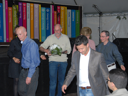 Ao final das falas da autoridades presentes, o escritor homenageado desta edição da Feira, Mauro Klafke recebeu uma placa e flores em reconhecimento ao seu trabalho.