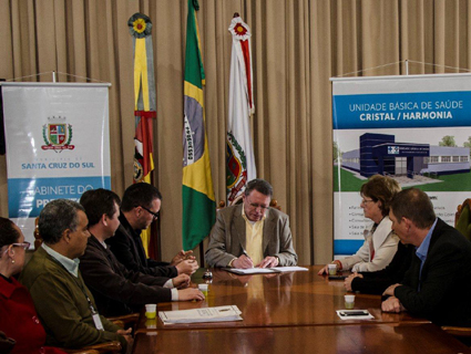 O prefeito Telmo Kirst autorizou na manhã desta sexta-feira, 11, o início da construção da UBS Cristal/Harmonia, no Bairro Santa Vitória. A assinatura do termo de início de obras ocorreu no Palacinho da Praça da Bandeira e contou com a presença da vice-prefeita, Helena Hermany; dos secretários municipais de Saúde, Carlos Behm; de Planejamento e Gestão, Jeferson Gerhardt; e do sócio-gerente da EVEM Construções Ltda., Emerson Roberto Puntel.