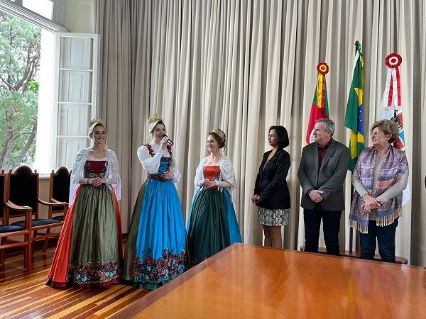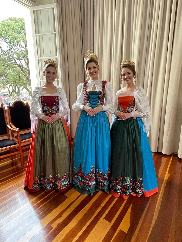 Com inspiração em trajes típicos de diferentes regiões antigas de cultura germânica, como Hamburgo, Braun-schweig, Hessen, Baviera e Prússia, bem como na Alemanha moderna, integrada pelos mais diferentes povos e culturas (a exemplo de Santa Cruz do Sul), foram apresentados na tarde desta quarta-feira, 24, em cerimônia realizada no Palacinho da Praça da Bandeira, os vestidos oficiais das soberanas da 37ª Oktoberfest e Feirasul, Rainha Daniele Andressa Müller e as Princesas, Thaissy Balczarek e Estéfani Aline Wegmann. “São modelos que reforçam as tradições, mas também a alegria da nossa festa e da nossa cidade. Representam mais do que valorização da nossa herança cultural, mas o nosso olhar para uma festa contemporânea e multicultural”, destacou a presidente da Festa da Alegria, Roberta Pereira.