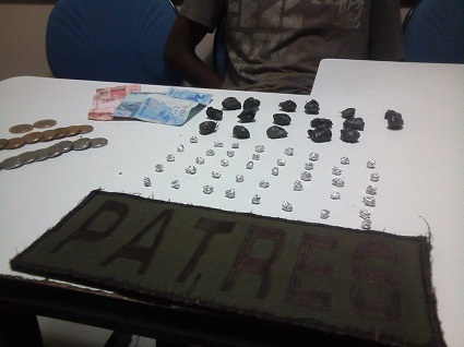 Por volta das três horas, a guarnição da BM avistou duas pessoas próximas a um conhecido ponto de tráfico na Rua 01 da Vila Batistti. Ao serem abordados, um dos indivíduos tentou fugir. ele foi perseguido e capturado, e com o rapaz os policiais encontraram no interior de um frasco de desodorante 41 pedras de crack, 18 porções de maconha e R$ 21,00. Segundo a Brigada, o segundo indivíduo seria um usuário que estaria realizando a compra de entorpecentes.