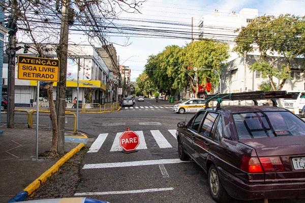 Outra mudança que está sendo implementada e que já passa a valer a partir de hoje é a retirada do siga livre à esquerda, no cruzamento para os veículos que se deslocam pela rua Júlio de Castilhos. Os motoristas agora deverão obedecer ao semáforo. Em breve deverá ser instalado no local também um semáforo para travessia de pedestres.