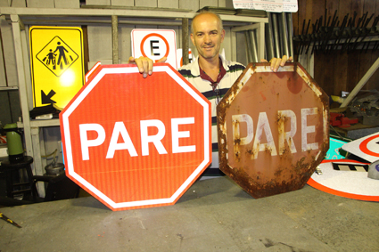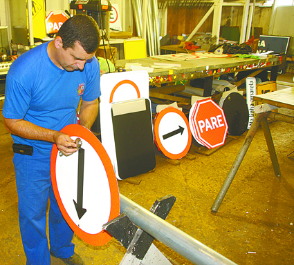 O desenhista de placas Carlos Alexandre Bangel mostra a diferença entre a nova e a antiga