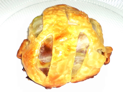 Corte a linguiça e o lombo em cubos médios e corte os legumes em cubinhos. Refogue a guarnição aromática (cebola, cenoura, aipo e alho-poró) e adicione o lombo temperado com sal, pimenta e alecrim. Adicione a linguiça e reserve. Quando estiver frio, adicione os ovos. Branqueie as folhas de repolho inteiras. Abra a massa folhada, corte em retângulos e em cada retângulo faça cortes longitudinais. Recheie a folha de repolho com a carne e envolva na massa folhada. Pincele com ovo e asse no forno pré-aquecido, em 200°, por 20 a 25 minutos.