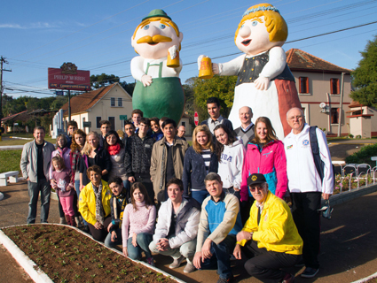Uma passagem rápida, mas suficiente para conhecer as tradicionais cucas de Santa Cruz do Sul. Assim foi na manhã do sábado, 21 de julho, quando 19 jovens intercambistas fizeram uma parada no trevo de acesso ao município, junto aos bonecos Fritz e Frida.