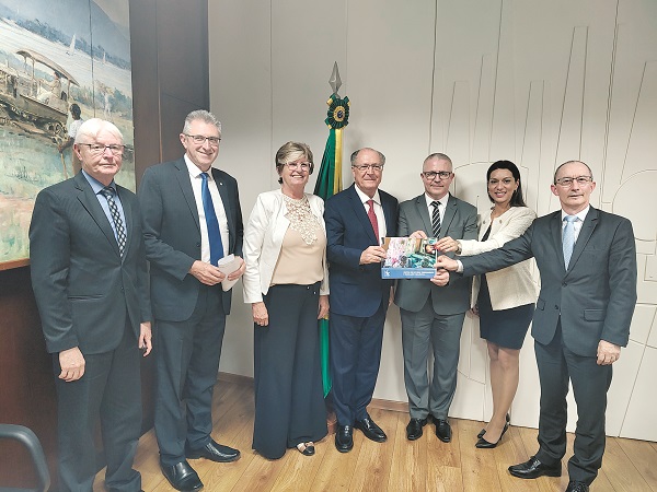 O projeto do novo prédio que deverá ser erguido junto ao Hospital Santa Cruz (HSC) para servir como espaço de ensino para a área de Medicina da Universidade de Santa Cruz do Sul (Unisc) foi apresentado na terça-feira, dia 20, ao vice-presidente da República, Geraldo Alckmin (PSB). O documento foi entregue pelo presidente da Associação Pró-Ensino em Santa Cruz do Sul (Apesc) e reitor da Unisc, Rafael Henn, e pelo diretor-geral do HSC, Vilmar Thomé. Também estavam presentes o vice-presidente da Apesc, Benício Werner; o deputado federal Heitor Schuch (PSB-RS), que intermediou o encontro; a prefeita de Santa Cruz, Helena Hermany (Progressistas); e a assessora para projetos e captação de recursos da Apesc, Luiza Machado Lima Knak.