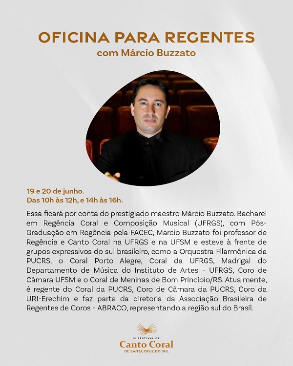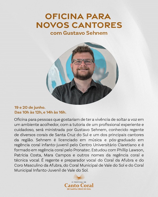 Como antecipa o músico Gustavo Sehnem, idealizador do evento, a programação conta com dois encontros de corais, além das oficinas ministradas por músicos convidados. “Serão oferecidas oficinas pela manhã e à tarde, e os encontros de corais ocorrerão à noite, sempre a partir das 19h”, explica.