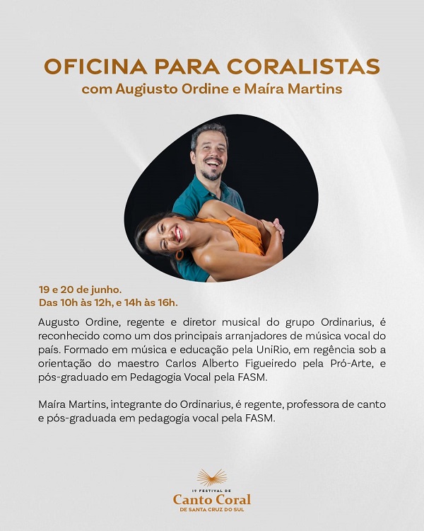 As inscrições para participar das oficinas já estão encerradas, mas os encontros de canto coral são abertos a todo o público. Segundo Sehnem, a procura pelas oficinas já surpreendeu. “Por mais que tenhamos um histórico de canto coral, não temos um histórico de oficinas e de um festival relacionado a isso”, explica. “Tivemos 60 inscritos na oficina de coralistas, 12 inscritos na oficina de novos cantores, que é uma coisa nova”.