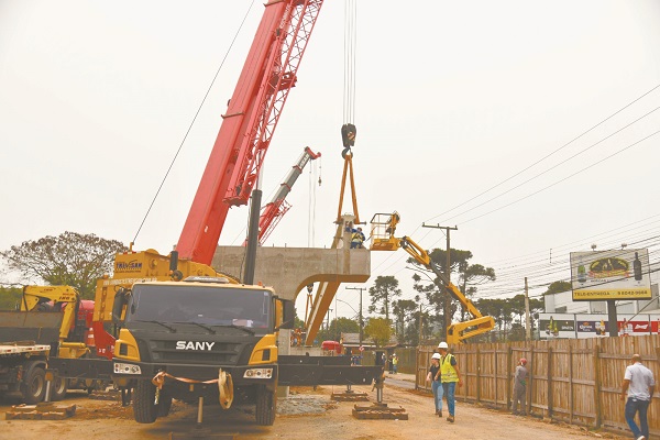 O consórcio responsável pela condução do projeto, formado pelas empresas Giovanella e Porto Beton, começou o transporte e instalação das vigas longarinas sobre os pilares da estrutura.