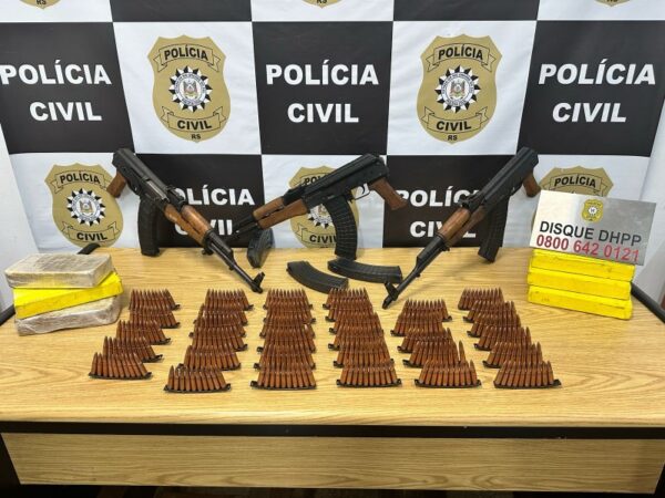 Na noite desta segunda-feira (07), a Polícia Civil, por meio da 2ª Delegacia de Homicídios e Proteção à Pessoa de Porto Alegre (2ªDPHPP), apreendeu três fuzis AK-47, seis carregadores, 340 munições de calibre 7,62, 4 kg de cocaína e 2 kg de crack. As apreensões ocorreram em uma residência no bairro Vila Nova, em Porto Alegre, que estava sendo utilizada por integrantes de um grupo criminoso que se preparavam para realizar um ataque a um grupo criminoso rival.