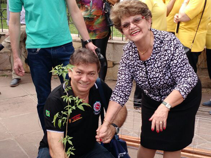 Secretário Raul e Maria Conceição plantando a muda de árvore em agradecimento à cidade