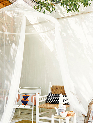 Um cantinho especial – Quem tem um espaço na área externa pode investir em uma ideia diferente e apostar no tecido para um arremate caprichado. Nesse caso, existem materiais específicos para deixar o ambiente fresco e leve. Os mais indicados são o voil e o nylon delfim, perfeitos para montar uma espécie de gazebo e mosquiteiro envolta das cadeiras. Assim, você cria um cantinho reservado para encontros especiais e momentos de paz.