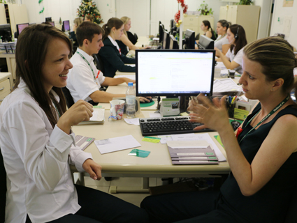 Curso de Libras facilitou a comunicação entre Catiucia (à direita) e os colegas da área de cadastro da Unimed VTRP