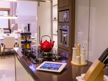 Com a intenção de recepcionar e reunir, foi criado o Espaço Gourmet, o qual possui bar, churrasqueira, forno e forgão à lenha. A iluminção, em LED RGB, é responsável por criar um clima descontraído e moderno possibilitando a dinâmica das cores.