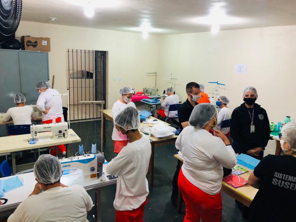 Devido ao problema de saúde pública, o Estado estava encontrando dificuldades para adquirir equipamentos de proteção para os servidores. Foi então que se teve a ideia de usar a oficina de corte e costura montada em Lajeado para confeccionar máscaras. “A matéria-prima para produzir as máscaras foi adquirida pela Susepe através de recursos do Estado para destinação de servidores e presos e também passamos a receber doações de tecidos para fabricação de máscaras doadas para entidades e comunidade”, destaca a delegada.