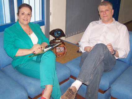 A candidata Carmen Helfer acompanhada por Angelo Hoff em visita ao Riovale Jornal
