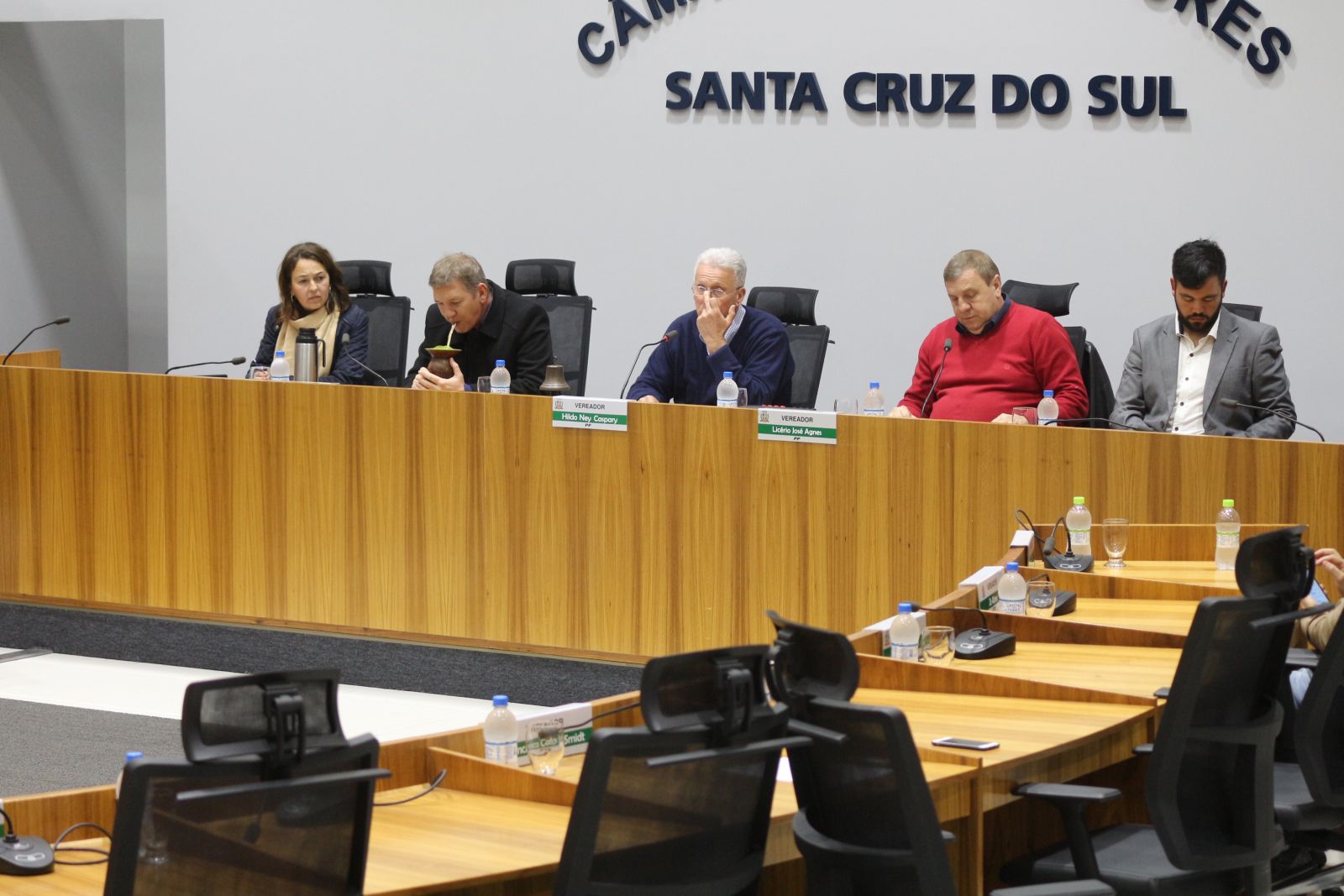 A reunião foi comandada pelo vereador Hildo Ney Caspary (Progressistas) e contou ainda com a presença do vereador André Scheibler (SD), integrante da Comissão de Obras e Serviços Públicos; do secretário de Planejamento, Jéferson Gerhardt; da arquiteta e urbanista Carina Peiter Ramos, secretária do Centro de Pesquisa e Qualidade Urbana e Rural (Cipur) e de Bruno Deprá, do Núcleo de Gestão Pública da Unisc. A Comissão de Obras e Serviços Públicos tem como relator o vereador Hildo Ney Caspary (Progressistas); presidente Mathias Bertram (PTB) e secretário André Francisco Scheibler (SD).