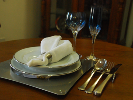 Mesa posta com louça de porcelana, taças de cristal Strauss e talheres, argola e souplast com cristais Swarovski
