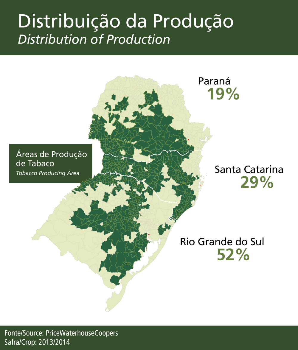 A Região Sul é responsável por 96% da produção brasileira. Dos 1.191 municípios que formam a Região Sul, 55% são produtores de tabaco. É em solo gaúcho que 52% da produção de tabaco é cultivada; Santa Catarina responde por 29%, seguida do Paraná, com 19%. Em muitos municípios, o tabaco é a principal atividade econômica, desempenhando um relevante papel social para milhares de cidadãos sul-brasileiros.