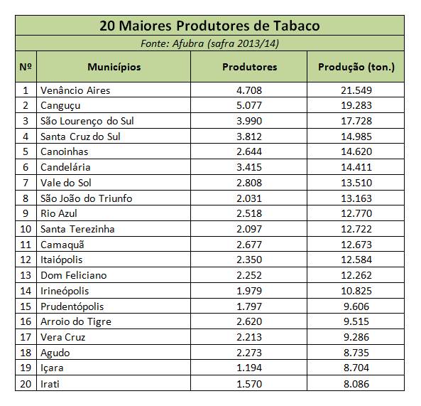 Venâncio Aires (RS) ocupa a liderança do ranking, com 21,5 mil toneladas produzidas, de acordo com dados da Associação dos Fumicultores do Brasil (Afubra). Em volume de produção aparecem na sequência: Canguçu (RS), São Lourenço do Sul (RS), Santa Cruz do Sul (RS), Canoinhas (SC), Candelária (RS), Vale do Sol (RS), São João do Triunfo (PR), Rio Azul (PR) e Santa Terezinha (SC).