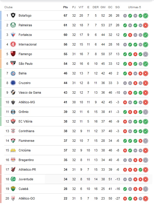 CLASSIFICAÇÃO BRASILEIRÃO 2024 – 32ª RODADA