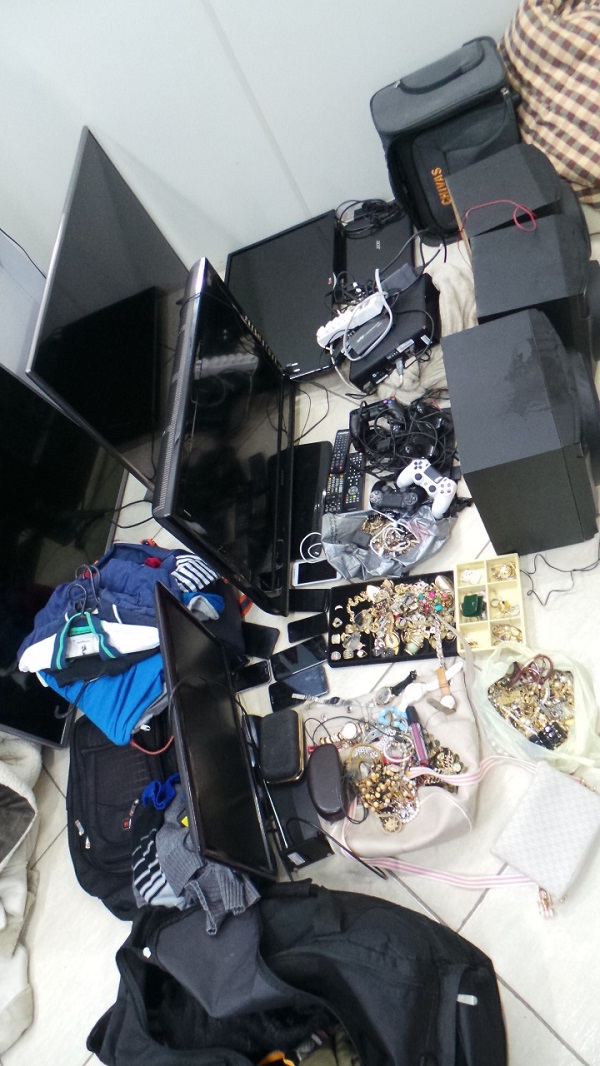 Após buscas na residência e identificação dos indivíduos, E.A.R, de 31 anos, D.P.E.K, de 23 anos, S.M.S, de 23 anos, E.S.R. de 29 anos, foram conduzidos presos pelos Policiais e com estes grande quantidade de objetos oriundos do furto, incluindo Notebook, PS2, X-Box, Televisores, roupas, joias, bijuterias, celulares, sons, cobertores, entre outros.