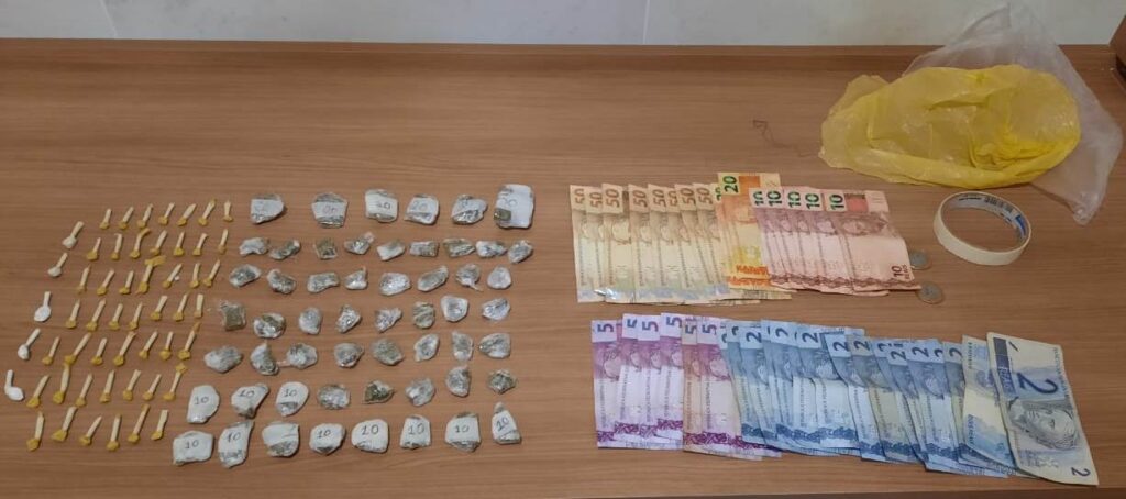 Ao perceber a aproximação dos policiais, ele tentou fugir, mas foi alcançado e abordado. Com ele foram localizadas quatro pedras de crack e duas porções de maconha. O suspeito confessou estar traficando e indicou o local de armazenamento do restante da droga, sendo localizadas mais 55 porções de maconha pesando 109 gramas, 50 pedras de crack pesando 11 gramas, três petecas de cocaína pesando uma grama e R$ 554 em dinheiro.
