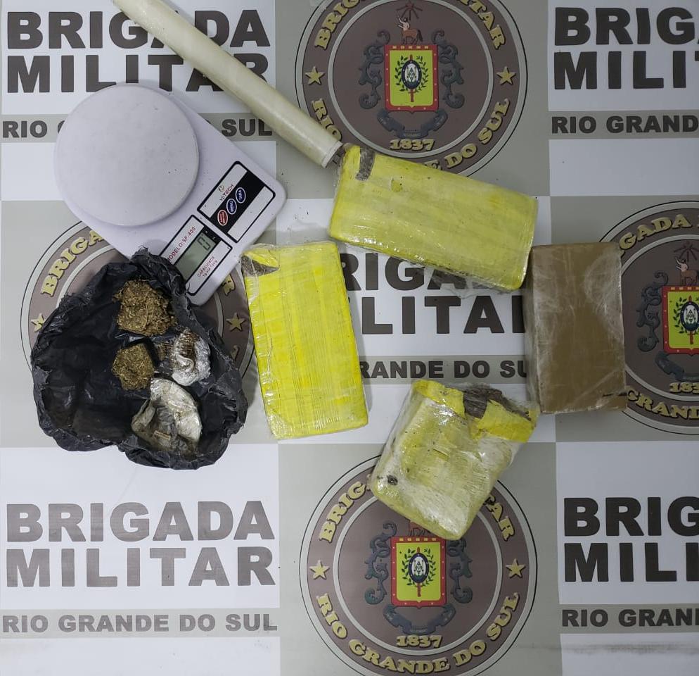 Após buscas, foi apreendida uma mochila de cor preta que continha: 04 tijolos, 03 pedaços avulsos e um invólucro de filme de substância entorpecente com características de maconha, totalizando aproximadamente 2,380 Kg, 01 balança de precisão e uma faca de cozinha.