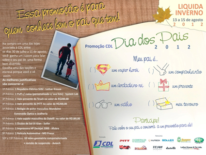 A Câmara de Dirigentes Lojistas (CDL) de Santa Cruz do Sul está realizando de 30 de julho a 11 de agosto a Promoção de Dia dos Pais. O consumidor que comprar nas lojas associadas à CDL até o dia 11 de agosto vai ganhar um cupom, no qual terá que preencher com seus dados, escolher um dos itens que identifica seu pai e justificar o porquê.