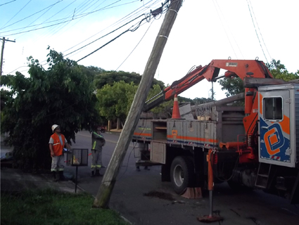 A chuva rápida, que chegou ontem em Santa Cruz do Sul, veio com um forte vento que provocou o tombamento de um poste na rua Doutor Arthur Germano Fett no bairro Arroio Grande. O poste, que ficou preso nos fios de energia elétrica, provocou a falta de energia nas imediações.
