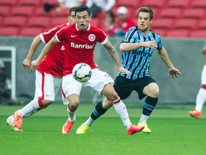 Deu Inter no Gre-Nal 402. O público de 37.222 pessoas que foi ao Beira-Rio no último domingo, 10 de agosto, acompanhou um clássico com bastante marcação. O Inter, que depositava suas esperanças nos estrangeiros Aránguiz e D’Alessandro, pouco chegou no primeiro tempo ao ataque do Grêmio, este que, modificado com as alterações feitas por Felipão, utilizando Pará na lateral esquerda, Ramiro na lateral direita, Walace e Fellipe Bastos de volantes e um ataque com Dudu e Barcos, chegou mais ao ataque rival, com um chute de fora da área de Pará aos 18 minutos em que Dida espalmou para escanteio, e uma grande oportunidade com Dudu, aos 37 minutos, em que Giuliano encontrou o atacante sozinho na grande área, mas em um chute bizarro o jogador do Grêmio mandou a bola na lateral.