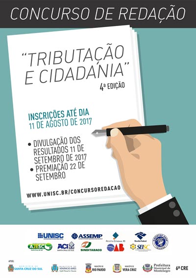 Será apresentado nesta quinta-feira, dia 8 de junho, às 11 horas, no Auditório do Sincotec/Varp, em Santa Cruz do Sul, o edital regulamentando a 4ª edição do concurso de Redação, tendo como temática Tributação e Cidadania. A promoção é do Comitê Tributário Permanente de Santa Cruz do Sul, composto pelas seguintes entidades: ACI, Assemp, Ajesc, Comdica, OAB Subseção de Santa Cruz do Sul, Prefeitura Municipal, Receita Federal, Receita Estadual, Seisc, Sincotec/Varp, Sinditabaco e Unisc, que se reúnem periodicamente para debater temas vinculados à tributação e à aplicação de recursos públicos. Também apoiam o concurso o Governo do Estado do Rio Grande do Sul, por meio da Secretaria Estadual de Educação, as prefeituras municipais de Montenegro, Rio Pardo, Santa Cruz do Sul, Venâncio Aires e Vera Cruz, por meio das suas secretarias municipais de Educação, a ONG João da Silva e o Comdica de Santa Cruz do Sul.