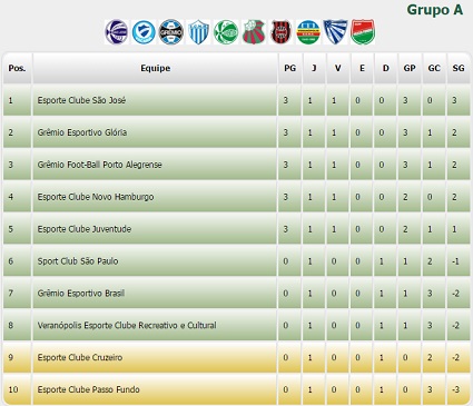 Classificação (sem os 4 times que não estrearam. Fonte: FGF)