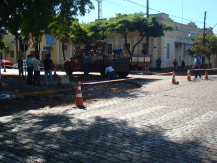 As primeiras ações da equipe da Secretaria de Obras foram fechar o acesso a rua Tiradentes pela Galvão Costa e em seguida iniciar a retirada dos paralelepípedos do entorno das calçadas da rua Tiradentes no seu cruzamento com a rua Marechal Floriano.