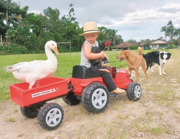 As redes sociais se tornaram, com o passar do tempo, fontes de informações e também de histórias positivas que se traduzem em verdadeiros exemplos a serem seguidos. Foi assim, pela plataforma do Instagram, que tomei conhecimento das imagens em vídeo do pequeno Heitor Borges (@bebecampeiro_oficial). Sagitariano, nascido em 30 de novembro de 2020, tem apenas 3 anos. No volante de seu pequeno trator, com vários vagões acoplados, ele dirige levando em sua companhia vários bichinhos de estimação. O que me chamou atenção foi o carinho com que ele trata todos eles. Antes de sair em seu trajeto no sítio onde reside, ele dá beijinhos em todos em uma demonstração de proteção e cuidado. A família mora na cidade de Joinville, Santa Catarina, e esta história tinha que ser mostrada, mesmo sendo de outro Estado. A propriedade é alugada, mas nutrem o sonho de um dia terem um lugar somente deles e expandir ainda mais a paixão pelos animais.