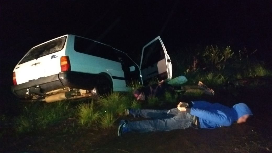 Com as informações do ocorrido, uma guarnição do 23º Batalhão de Polícia Militar, orientado pela Sala de Operações, foi até o local e encontrou em uma das margens da rodovia. Um dos indivíduos presos estava dentro do carro, enquanto o outro estava na parte externa do veículo, verificando o capô do automóvel.