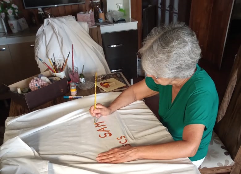 Embora tenha passado grande parte de sua vida atuando como professora, as mesmas mãos que repassaram aprendizado a muitos de seus alunos santa-cruzenses, agora contribuem para ajudar mais pessoas, só que de um jeito diferente: através da reforma de tecidos e de pintura de siglas para identificar roupas de cama. “A gente tem que ajudar, cada um deve fazer a sua parte se tem condições”, afirma.