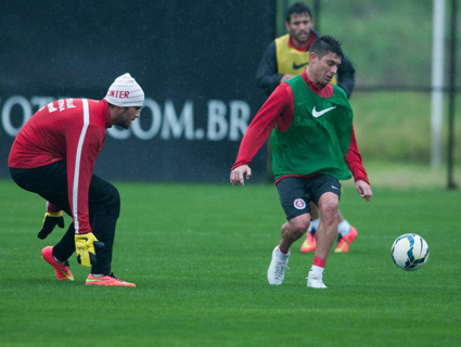 Abaixo de frio e muita chuva, a equipe colorada deu seguimento aos trabalhos para o próximo desafio pelo Campeonato Brasileiro. No Centro de Treinamentos do Parque Gigante, o grupo realizou novo ensaio na manhã de ontem, 23 de julho, visando o jogo de sábado, diante do Bahia, em Salvador, na Arena Fonte Nova. Na atividade promovida no gramado do CT, o técnico Abel Braga primeiramente comandou um treino de dois toques em campo reduzido. Na sequência, o grupo foi dividido por setores para um treino técnico. Os goleiros trabalharam em separado, realizando exercícios específicos. Quem ficou de fora foi D’Alessandro, que passou por um procedimento odontológico. Porém, o argentino não preocupa e deve estar em campo no final de semana. Quem certamente estará de fora do embate com os baianos são Aránguiz e Valdívia. A lesão do chileno é no ligamento colateral medial do joelho direito e a do garoto no músculo adutor da coxa. Ambos fazem tratamento fisioterápico. Jorge Henrique, com dores no tendão de aquiles esquerdo, será submetido a exame e reavaliado. A boa notícia é Alex, que treina normalmente desde ontem e vira opção para o treinador escalar o time. No momento, o Inter é o quinto colocado, com 19 pontos, os mesmos do Fluminense, terceiro na tabela. A distância para o líder Cruzeiro é de seis pontos e para o vice Corinthians, um.