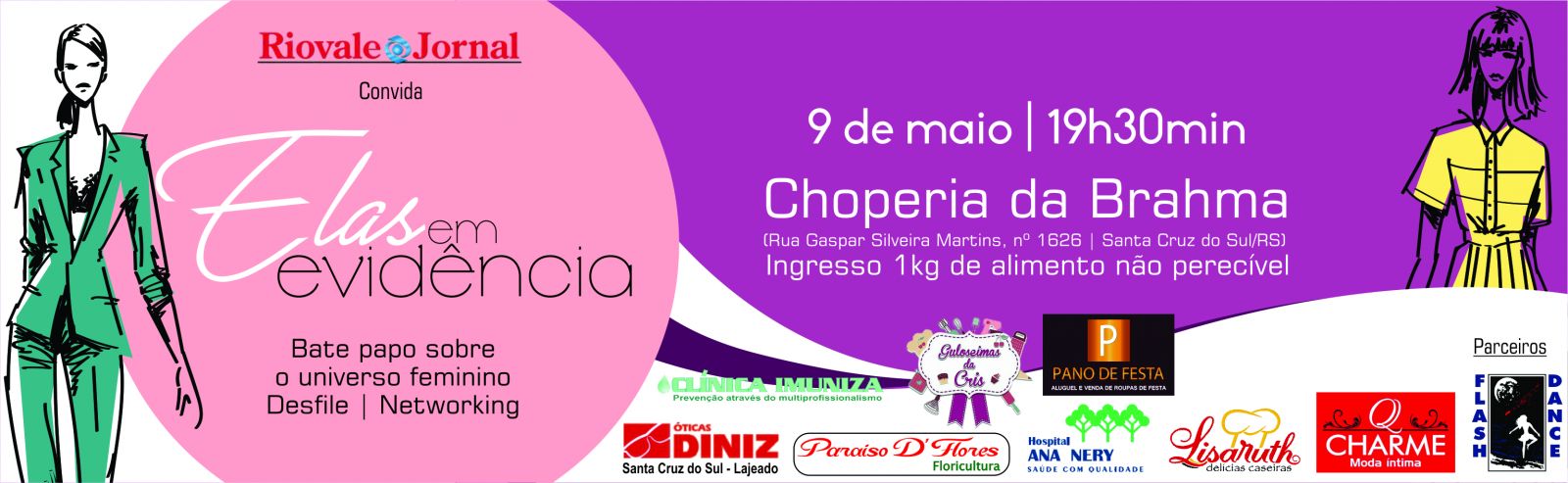 Mais uma edição do ‘Elas em Evidência’, bate papo sobre universo feminino com desfiles e networking acontece na próxima quinta-feira, 9 de maio, às 19h30, na Choperia da Brahma, rua Gaspar Silveira Martins, nº1626. O evento é promovido pelo Riovale Jornal e o ingresso é a entrega de 1kg de alimento não perecível que será destinado a uma entidade social de Santa Cruz do Sul.