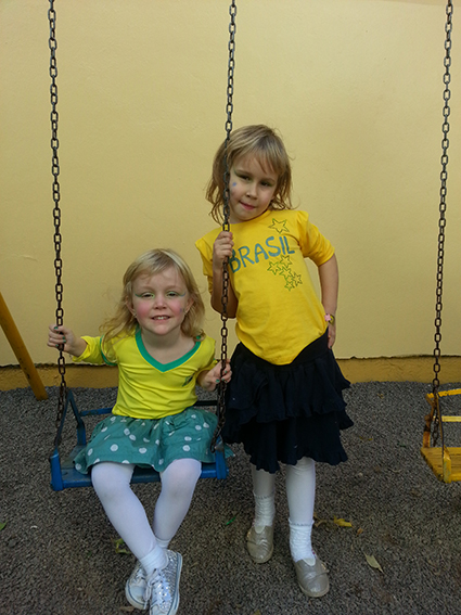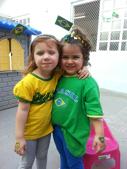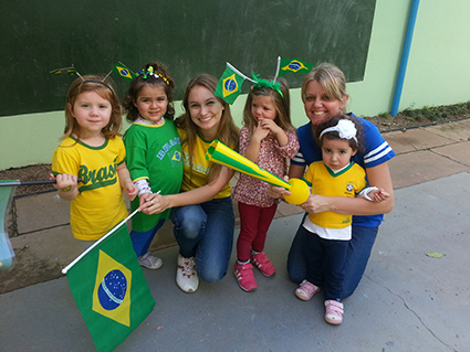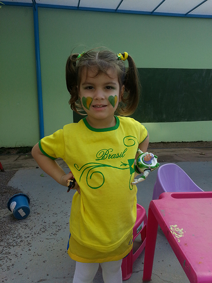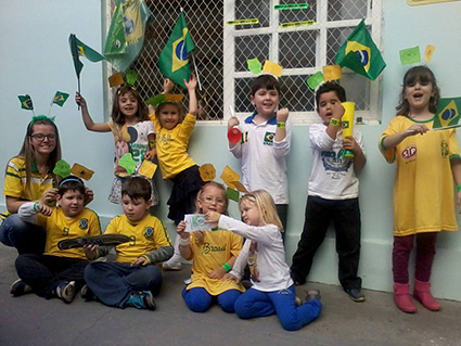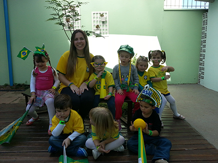 As crianças e professoras da Escola Infantil Alegria estão na maior torcida pelo Brasil. Tudo foi decorado em tons verde e amarelo e, nos dias de jogos, alunos e professores vestem as cores do nosso querido país. Entre muitos apetrechos, até a pipoca na cor da bandeira do Brasil foi preparada para as crianças.