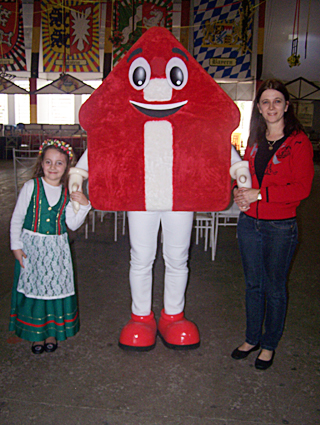 Roseli e Bruna com o mascoteAmigobel, da Imobel