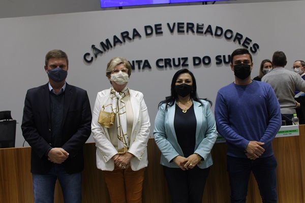 Outro registro que foi feito foi das duas mulheres prefeitas, Kelly e Helena com o vereador Francisco Carlos Smidt (PSDB), que ocupou o cargo no final do ano passado, por dez dias, quando da morte do prefeito Telmo José Kirst. “É um registro para a história”, comentou Smidt.