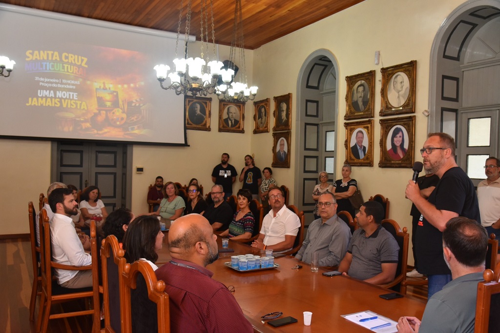 A programação foi apresentada pelo secretário de Cultura e Economia Criativa, Douglas Albers. “Com certeza será uma noite histórica, em pleno mês de janeiro”, garantiu Albers. Ainda segundo ele, a ideia é fazer o município avançar cada vez mais na área da cultura. “O objetivo de um governo é fomentar a cultura, o turismo, é fomentar todas as outras áreas e isso tudo reverter em desenvolvimento econômico da cidade. E é isso que a gente está fazendo e é por isso que a gente tem colocado criatividade em nossas ações, para que a gente possa fazer Santa Cruz se desenvolver cada vez mais culturalmente, turisticamente e em todas as outras áreas”, afirmou. Ainda de acordo com o secretário, o Santa Cruz Multicultural deve ser levado aos bairros do município durante o ano.