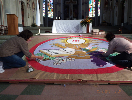 Os tapetes que são preparados para a data são feitos de diversos materiais, como pedra moída, serragem, tampinhas de garrafas, etc. Lucia, coordena os trabalhos desde 1988, diz que serão feitos tapetes desde o altar da catedral até a rua, se não houver chuva.
