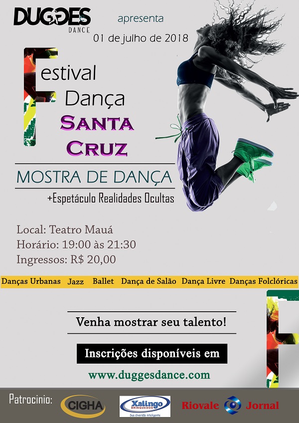 Tem muita dança e arte em Santa Cruz do Sul no próximo domingo, 1º de Julho, é o Festival Dança Santa Cruz realizado pelo Dugges Dance. O evento, com o objetivo de estimular a dança no município e proporcionar um ambiente adequado e com infraestrutura que valoriza o artista e o público, tem o apoio do Riovale Jornal e patrocínio da Cigha e Xalingo Brinquedos.