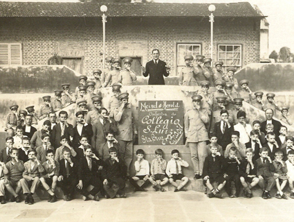 Registro da Orquestra do Colégio São Luís, tendo ao fundo o prédio inaugural