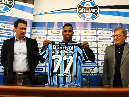 Depois de oficializar a contratação do atacante Fernandinho como novo reforço do Tricolor, o Grêmio fez a apresentação oficial do atleta à imprensa e ao torcedor na manhã de ontem, 11 de julho. Na ocasião, estiveram presentes também o presidente Fábio Koff, os vice-presidentes Romildo Bolzan e Odorico Roman, além do executivo de Futebol, Rui Costa e o assessor de Futebol, Marcos Chitolina. Fernandinho vestiu a camisa número 77 do Grêmio pela primeira vez e não escondeu sua satisfação: “Venho com objetivo de ganhar títulos. Sei da responsabilidade que tenho e quero ajudar da melhor forma possível. O grupo é muito bom e isso facilita”, declarou.
